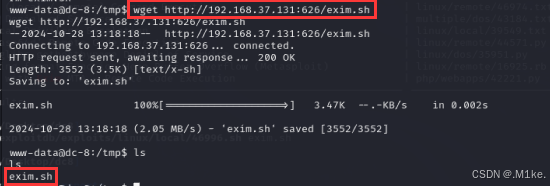 回到靶机的shell中,首先切换到tmp目录下,再使用wget命令将这个文件下载下来