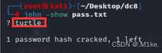 这里我爆了半天没有结果,似乎是因为 admin 爆破不出来以至于跑了很久我就给他停掉了,如何使用参数 --show 查看,可以发现 john 账户的密码被爆破出来了