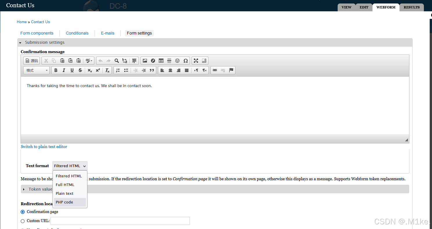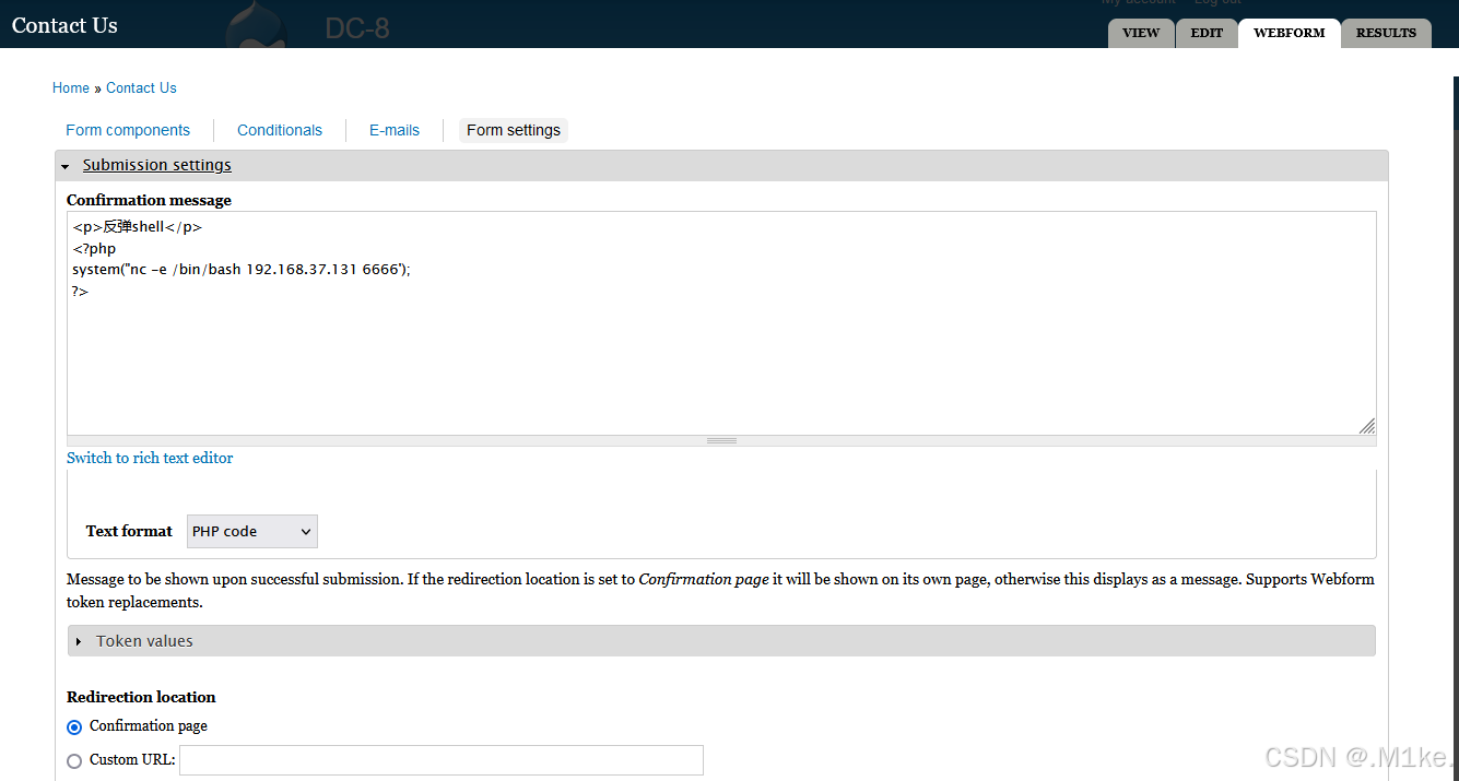 更改Text format 为 PHP code ,更改内容写一个反弹shell
