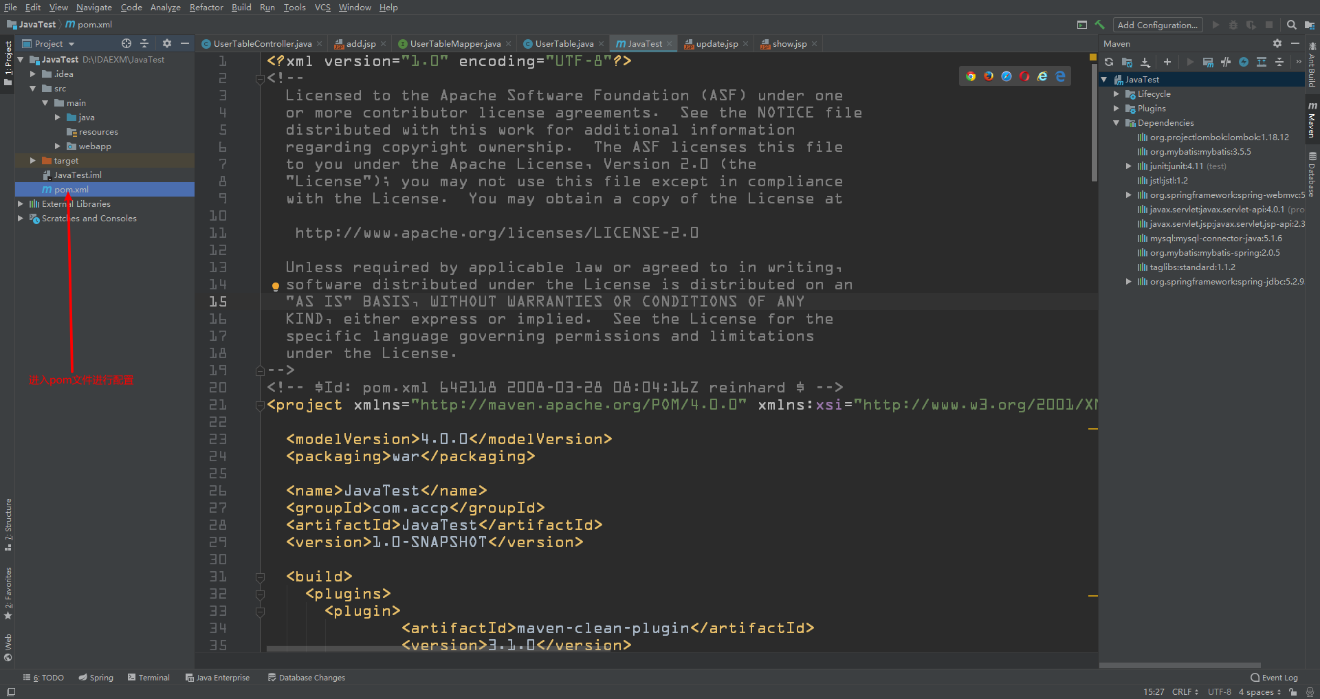 <?xml version="1.0" encoding="UTF-8"?> <!-- Licensed to the Apache Software Foundation (ASF) under one or more contributor license agreements. See the NOTICE file distributed with this work for additional information regarding copyright ownership. The ASF licenses this file to you under the Apache License, Version 2.0 (the "License"); you may not use this file except in compliance with the License. You may obtain a copy of the License at http://www.apache.org/licenses/LICENSE-2.0 Unless required by applicable law or agreed to in writing, software distributed under the License is distributed on an "AS IS" BASIS, WITHOUT WARRANTIES OR CONDITIONS OF ANY KIND, either express or implied. See the License for the specific language governing permissions and limitations under the License. --> <!-- $Id: pom.xml 642118 2008-03-28 08:04:16Z reinhard $ --> <project xmlns="http://maven.apache.org/POM/4.0.0" xmlns:xsi="http://www.w3.org/2001/XMLSchema-instance" xsi:schemaLocation="http://maven.apache.org/POM/4.0.0 http://maven.apache.org/maven-v4_0_0.xsd"> <modelVersion>4.0.0</modelVersion> <packaging>war</packaging> <name>JavaTest</name> <groupId>com.accp</groupId> <artifactId>JavaTest</artifactId> <version>1.0-SNAPSHOT</version> <build> <plugins> <plugin> <artifactId>maven-clean-plugin</artifactId> <version>3.1.0</version> </plugin> <!-- see http://maven.apache.org/ref/current/maven-core/default-bindings.html#Plugin_bindings_for_war_packaging --> <plugin> <artifactId>maven-resources-plugin</artifactId> <version>3.0.2</version> </plugin> <plugin> <artifactId>maven-compiler-plugin</artifactId> <version>3.8.0</version> </plugin> <plugin> <artifactId>maven-surefire-plugin</artifactId> <version>2.22.1</version> </plugin> <plugin> <artifactId>maven-war-plugin</artifactId> <version>3.2.2</version> </plugin> <plugin> <artifactId>maven-install-plugin</artifactId> <version>2.5.2</version> </plugin> <plugin> <artifactId>maven-deploy-plugin</artifactId> <version>2.8.2</version> </plugin> <plugin> <groupId>org.mortbay.jetty</groupId> <artifactId>maven-jetty-plugin</artifactId> <version>6.1.7</version> <configuration> <connectors> <connector implementation="org.mortbay.jetty.nio.SelectChannelConnector"> <port>8888</port> <maxIdleTime>30000</maxIdleTime> </connector> </connectors> <webAppSourceDirectory>${project.build.directory}/${pom.artifactId}-${pom.version}</webAppSourceDirectory> <contextPath>/</contextPath> </configuration> </plugin> <plugin> <groupId>org.apache.tomcat.maven</groupId> <artifactId>tomcat7-maven-plugin</artifactId> <version>2.1</version> <configuration> <port>8080</port> <uriEncoding>UTF-8</uriEncoding> </configuration> </plugin> </plugins> </build> <dependencies> <dependency> <groupId>org.projectlombok</groupId> <artifactId>lombok</artifactId> <version>1.18.12</version> </dependency> <dependency> <groupId>org.mybatis</groupId> <artifactId>mybatis</artifactId> <version>3.5.5</version> </dependency> <dependency> <groupId>junit</groupId> <artifactId>junit</artifactId> <version>4.11</version> <scope>test</scope> </dependency> <dependency> <groupId>jstl</groupId> <artifactId>jstl</artifactId> <version>1.2</version> </dependency> <dependency> <groupId>org.springframework</groupId> <artifactId>spring-webmvc</artifactId> <version>5.2.8.RELEASE</version> </dependency> <dependency> <groupId>javax.servlet</groupId> <artifactId>javax.servlet-api</artifactId> <version>4.0.1</version> <scope>provided</scope> </dependency> <dependency> <groupId>javax.servlet.jsp</groupId> <artifactId>javax.servlet.jsp-api</artifactId> <version>2.3.0</version> <scope>provided</scope> </dependency> <dependency> <groupId>mysql</groupId> <artifactId>mysql-connector-java</artifactId> <version>5.1.6</version> </dependency> <dependency> <groupId>org.mybatis</groupId> <artifactId>mybatis-spring</artifactId> <version>2.0.5</version> </dependency> <dependency> <groupId>taglibs</groupId> <artifactId>standard</artifactId> <version>1.1.2</version> </dependency> <dependency> <groupId>org.springframework</groupId> <artifactId>spring-jdbc</artifactId> <version>5.2.9.RELEASE</version> </dependency> <dependency> <groupId>jstl</groupId> <artifactId>jstl</artifactId> <version>1.2</version> </dependency> </dependencies> </project>