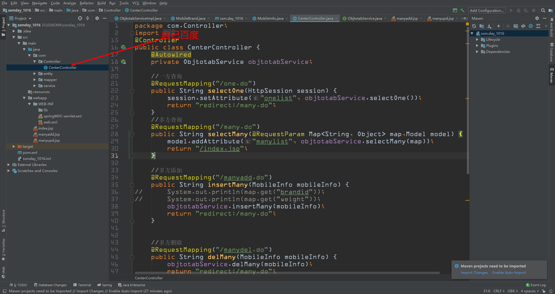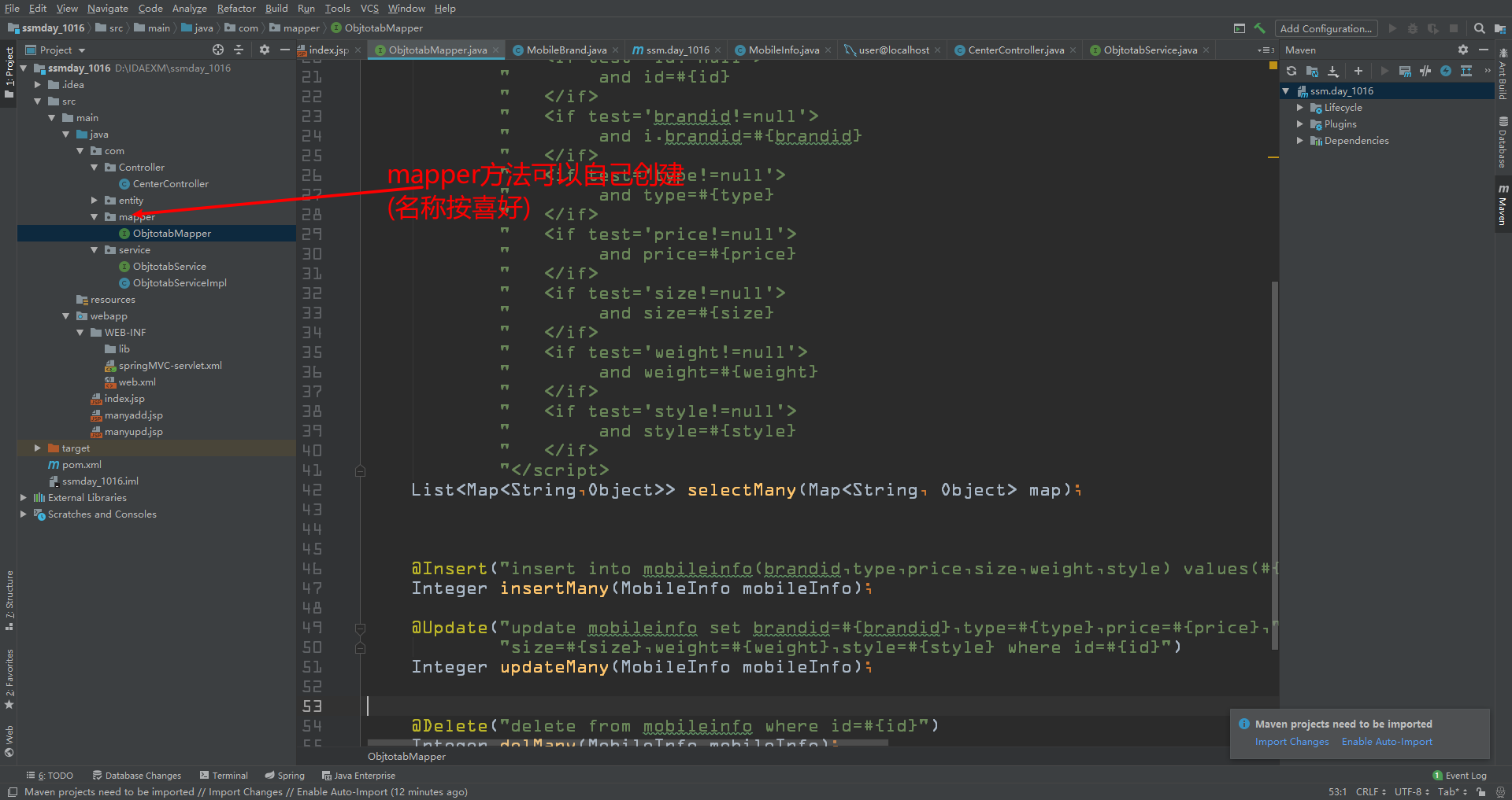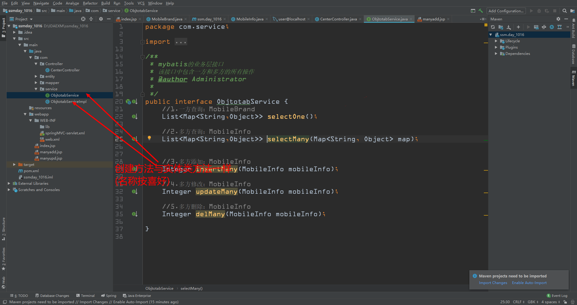 package com.service; import java.util.List; import java.util.Map; import org.apache.ibatis.annotations.Delete; import org.apache.ibatis.annotations.Insert; import org.apache.ibatis.annotations.Select; import org.apache.ibatis.annotations.Update; import com.entity.MobileBrand; import com.entity.MobileInfo; /** * mybatis的业务层接口 * 该接口中包含一方和多方的所有操作 * @author Administrator * */ public interface ObjtotabService { //1.一方查询:MobileBrand List<Map<String,Object>> selectOne(); //2.多方查询:MobileInfo List<Map<String,Object>> selectMany(Map<String, Object> map); //3.多方添加:MobileInfo Integer insertMany(MobileInfo mobileInfo); //4.多方修改:MobileInfo Integer updateMany(MobileInfo mobileInfo); //5.多方删除:MobileInfo Integer delMany(MobileInfo mobileInfo); }