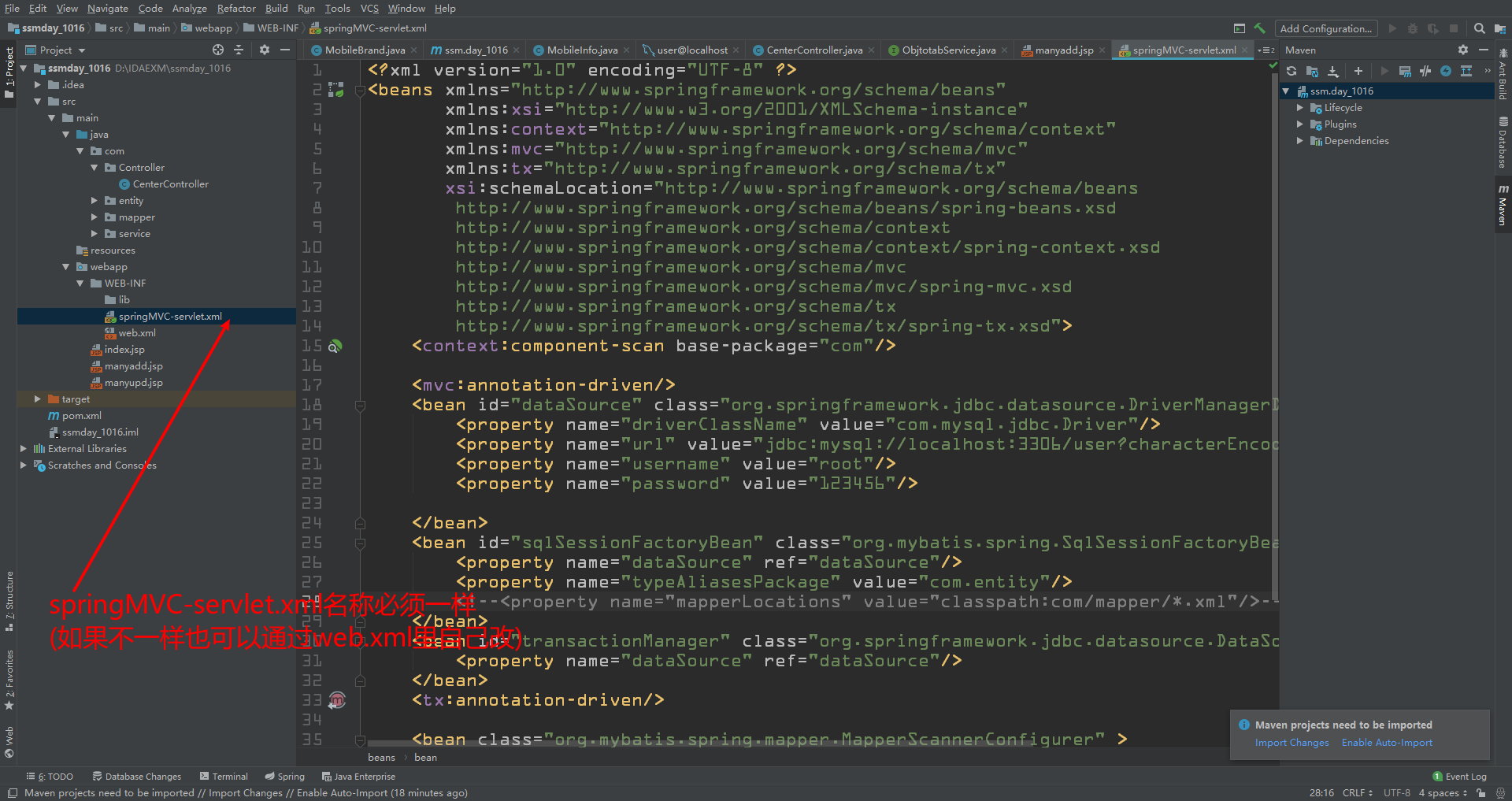 <?xml version="1.0" encoding="UTF-8" ?> <beans xmlns="http://www.springframework.org/schema/beans" xmlns:xsi="http://www.w3.org/2001/XMLSchema-instance" xmlns:context="http://www.springframework.org/schema/context" xmlns:mvc="http://www.springframework.org/schema/mvc" xmlns:tx="http://www.springframework.org/schema/tx" xsi:schemaLocation="http://www.springframework.org/schema/beans http://www.springframework.org/schema/beans/spring-beans.xsd http://www.springframework.org/schema/context http://www.springframework.org/schema/context/spring-context.xsd http://www.springframework.org/schema/mvc http://www.springframework.org/schema/mvc/spring-mvc.xsd http://www.springframework.org/schema/tx http://www.springframework.org/schema/tx/spring-tx.xsd"> <context:component-scan base-package="com"/> <mvc:annotation-driven/> <bean id="dataSource" class="org.springframework.jdbc.datasource.DriverManagerDataSource"> <property name="driverClassName" value="com.mysql.jdbc.Driver"/> <property name="url" value="jdbc:mysql://localhost:3306/user?characterEncoding=UTF-8"/> <property name="username" value="root"/> <property name="password" value="123456"/> </bean> <bean id="sqlSessionFactoryBean" class="org.mybatis.spring.SqlSessionFactoryBean"> <property name="dataSource" ref="dataSource"/> <property name="typeAliasesPackage" value="com.entity"/> <!--<property name="mapperLocations" value="classpath:com/mapper/*.xml"/>--> </bean> <bean id="transactionManager" class="org.springframework.jdbc.datasource.DataSourceTransactionManager"> <property name="dataSource" ref="dataSource"/> </bean> <tx:annotation-driven/> <bean class="org.mybatis.spring.mapper.MapperScannerConfigurer" > <property name="basePackage" value="com.mapper"/> </bean> </beans>