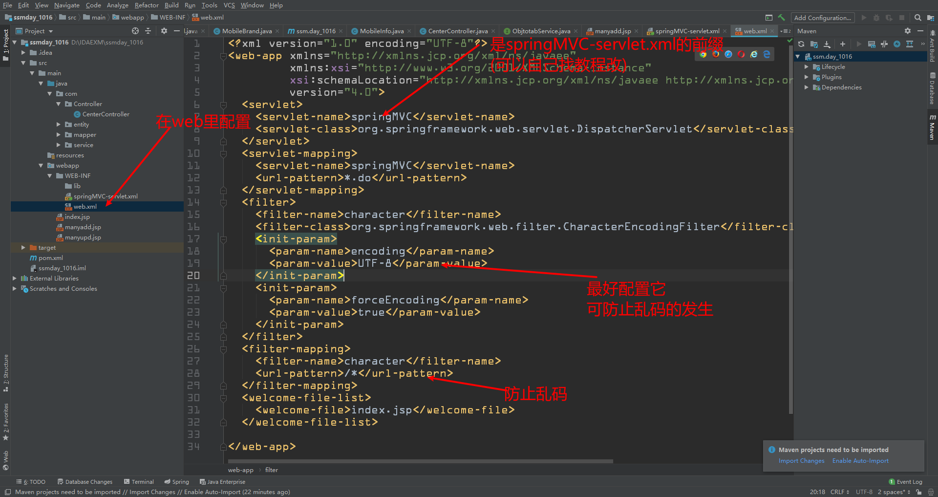 <?xml version="1.0" encoding="UTF-8"?> <web-app xmlns="http://xmlns.jcp.org/xml/ns/javaee" xmlns:xsi="http://www.w3.org/2001/XMLSchema-instance" xsi:schemaLocation="http://xmlns.jcp.org/xml/ns/javaee http://xmlns.jcp.org/xml/ns/javaee/web-app_4_0.xsd" version="4.0"> <servlet> <servlet-name>springMVC</servlet-name> <servlet-class>org.springframework.web.servlet.DispatcherServlet</servlet-class> </servlet> <servlet-mapping> <servlet-name>springMVC</servlet-name> <url-pattern>*.do</url-pattern> </servlet-mapping> <filter> <filter-name>character</filter-name> <filter-class>org.springframework.web.filter.CharacterEncodingFilter</filter-class> <init-param> <param-name>encoding</param-name> <param-value>UTF-8</param-value> </init-param> <init-param> <param-name>forceEncoding</param-name> <param-value>true</param-value> </init-param> </filter> <filter-mapping> <filter-name>character</filter-name> <url-pattern>/*</url-pattern> </filter-mapping> <welcome-file-list> <welcome-file>index.jsp</welcome-file> </welcome-file-list> </web-app>
