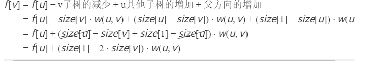 首先要定义两个数组:size[u]和f[u]。分别表示以 u 为根节点的子树内节点个数,以及树中所有结点到结点 u 的距离之和。紧接着,考虑DFS,在递归返回即回溯之时,将子节点的答案传给父亲。考虑f[]数组怎样计算?关注定义,由于是带权图(即使不带,默认为1),用组合计数的原理,一共有size[u]个节点,每个节点到父节点都要经过 w(u,v) 这条边,也就是会增加 size[u]*w(u,v) 的边权。这样就方便转移了。