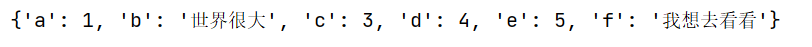 dictA={"a":1,"b":2,"c":3,"d":4,"e":5} dictA["b"]="世界很大" #这是修改 dictA["f"]="我想去看看" #这是新增 print(dictA)