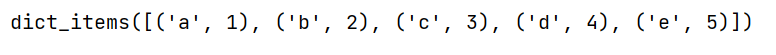 dictA={"a":1,"b":2,"c":3,"d":4,"e":5} a=dictA.items() print(a)