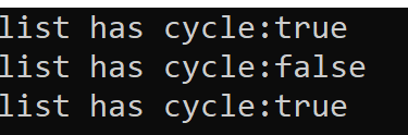 1 #include<iostream> 2 using namespace std; 3 4 struct ListNode { 5 int val; 6 ListNode *next; 7 ListNode(int x) : val(x), next(nullptr) {} 8 }; 9 10 11 class Solution { 12 public: 13 bool hasCycle(ListNode *head) { 14 if (head == nullptr || head->next == nullptr) { 15 return false; 16 } 17 ListNode *slow = head; 18 ListNode *fast = head->next; 19 while ((fast != nullptr) && (fast->next != nullptr)) { 20 slow = slow->next; 21 fast = fast->next->next; 22 if (slow == fast) { 23 return true; 24 } 25 } 26 return false; 27 } 28 }; 29 30 31 int main() 32 { 33 // 1->2->3->4->5->3 34 Solution *s1 = new Solution(); 35 ListNode node1(1); 36 ListNode node2(2); 37 ListNode node3(3); 38 ListNode node4(4); 39 ListNode node5(5); 40 node1.next = &node2; 41 node2.next = &node3; 42 node3.next = &node4; 43 node4.next = &node5; 44 node5.next = &node3; 45 46 std::cout << std::boolalpha; 47 std::cout << "list has cycle:" << s1->hasCycle(&node1) << endl; 48 // 修改节点5指向空,构造无环链表,1->2->3->4->5->nullptr 49 node5.next = nullptr; 50 std::cout << "list has cycle:" << s1->hasCycle(&node1) << endl; 51 // 修改节点5指向节点1,构造有环链表,1->2->3->4->5->1 52 node5.next = &node1; 53 std::cout << "list has cycle:" << s1->hasCycle(&node1) << endl; 54 delete s1; 55 return 0; 56 }