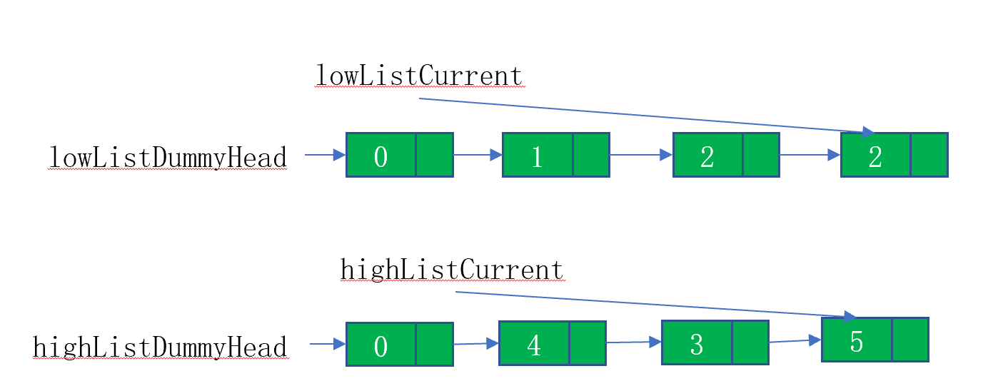 2、拼接两个链表,低链表当前节点的next指向高链表哑结点的next,就把两个链表拼接在一起了: