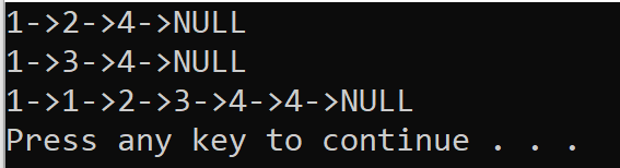 1 #include <iostream> 2 #include <vector> 3 4 using namespace std; 5 6 class ListNode { 7 public: 8 ListNode() : val(0), next(nullptr) {} 9 ListNode(int x) : val(x), next(nullptr) {} 10 ListNode(int x, ListNode *next) : val(x), next(next) {} 11 12 public: 13 int val; 14 ListNode *next; 15 }; 16 17 class Solution { 18 public: 19 ListNode* mergeTwoLists(ListNode* list1, ListNode* list2) { // 合并两个有序链表 20 ListNode *dummyNode = new ListNode(0); 21 ListNode *currentNode = dummyNode; 22 ListNode *newHead = nullptr; 23 while (list1 != nullptr && list2 != nullptr) { 24 if (list1->val <= list2->val) { 25 currentNode->next = list1; 26 list1 = list1->next; 27 } else { 28 currentNode->next = list2; 29 list2 = list2->next; 30 } 31 currentNode = currentNode->next; 32 } 33 if (list1 != nullptr) { 34 currentNode->next = list1; 35 } else { 36 currentNode->next = list2; 37 } 38 newHead = dummyNode->next; 39 delete dummyNode; 40 return newHead; 41 } 42 // 尾插法插入链表元素 43 void insertNodeAtTail(ListNode *&head, int val) { 44 ListNode *newNode = new ListNode(val); 45 ListNode *currentNode = head; 46 if (head == nullptr) { 47 head = newNode; 48 return; 49 } 50 while (currentNode->next != nullptr) { 51 currentNode = currentNode->next; 52 } 53 currentNode->next = newNode; 54 return; 55 } 56 // 打印链表元素 57 void printfListNode(ListNode *head) { 58 while (head != nullptr) { 59 std::cout << head->val << "->"; 60 head = head->next; 61 } 62 std::cout << "NULL" << endl; 63 return; 64 } 65 }; 66 int main() 67 { 68 Solution *test = new Solution(); 69 vector<int> vec1 = {1, 2, 4 }; 70 ListNode *list1 = nullptr; 71 // 插入节点 72 for (const auto &v : vec1) { 73 test->insertNodeAtTail(list1, v); 74 } 75 test->printfListNode(list1); // 1->2->4->NULL 76 77 vector<int> vec2 = {1, 3, 4 }; 78 ListNode *list2 = nullptr; 79 // 插入节点 80 for (const auto &v : vec2) { 81 test->insertNodeAtTail(list2, v); 82 } 83 test->printfListNode(list2); // 1->3->4->NULL 84 85 ListNode *mergedNewHead = test->mergeTwoLists(list1, list2); 86 test->printfListNode(mergedNewHead); // 1->1->2->3->4->4->NULL 87 88 delete test; 89 system("pause"); 90 return 0; 91 }