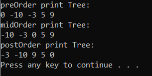 1 #include <iostream> 2 #include <vector> 3 4 using namespace std; 5 6 /** 7 Definition for a binary tree node. 8 */ 9 struct TreeNode { 10 int val; 11 TreeNode *left; 12 TreeNode *right; 13 TreeNode() : val(0), left(nullptr), right(nullptr) {} 14 TreeNode(int x) : val(x), left(nullptr), right(nullptr) {} 15 TreeNode(int x, TreeNode *left, TreeNode *right) : val(x), left(left), right(right) {} 16 }; 17 18 class Solution { 19 public: 20 TreeNode *helper(vector<int> nums, int first, int last) { 21 if (first > last) { 22 return nullptr; 23 } 24 // 到达叶子节点 25 if (first == last) { 26 TreeNode *parrent = new TreeNode(nums[first]); 27 return parrent; 28 } 29 int mid = first + (last - first) / 2; 30 TreeNode *leftChildNode = helper(nums, first, mid - 1); 31 TreeNode *rightChildNode = helper(nums, mid + 1, last); 32 TreeNode *parrent = new TreeNode(nums[mid]); 33 parrent->left = leftChildNode; 34 parrent->right = rightChildNode; 35 return parrent; 36 } 37 TreeNode* sortedArrayToBST(vector<int>& nums) { 38 if (nums.size() == 0) { 39 return nullptr; 40 } 41 if (nums.size() == 1) { 42 TreeNode *parrent = new TreeNode(nums[0]); 43 return parrent; 44 } 45 int first = 0; 46 int last = (int)nums.size() - 1; 47 return helper(nums, first, last); 48 } 49 50 void midOrderPrintTree(TreeNode *root) { 51 if (root == nullptr) { 52 return; 53 } 54 midOrderPrintTree(root->left); 55 cout << root->val << " "; 56 midOrderPrintTree(root->right); 57 return; 58 } 59 void preOrderPrintTree(TreeNode *root) { 60 if (root == nullptr) { 61 return; 62 } 63 cout << root->val << " "; 64 preOrderPrintTree(root->left); 65 preOrderPrintTree(root->right); 66 return; 67 } 68 void postOrderPrintTree(TreeNode *root) { 69 if (root == nullptr) { 70 return; 71 } 72 postOrderPrintTree(root->left); 73 postOrderPrintTree(root->right); 74 cout << root->val << " "; 75 return; 76 } 77 }; 78 int main() 79 { 80 vector<int> nums = {-10, -3, 0, 5, 9}; 81 Solution *test = new Solution(); 82 TreeNode *root = test->sortedArrayToBST(nums); 83 cout << "preOrder print Tree:" << endl; 84 test->preOrderPrintTree(root); 85 cout << endl; 86 87 cout << "midOrder print Tree:" << endl; 88 test->midOrderPrintTree(root); 89 cout << endl; 90 91 cout << "postOrder print Tree:" << endl; 92 test->postOrderPrintTree(root); 93 cout << endl; 94 system("pause"); 95 return 0; 96 }