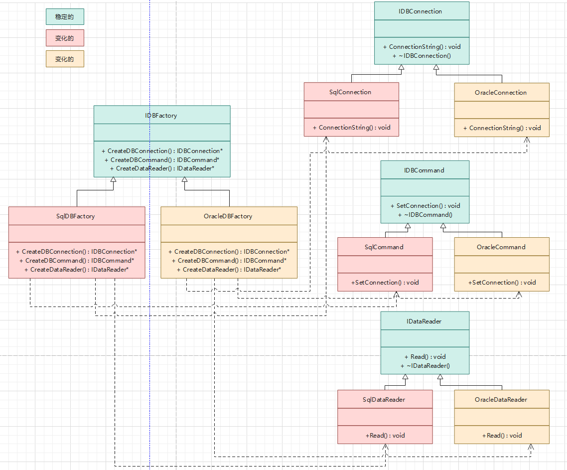 1 #include<iostream> 2 class IDBConnection { 3 public: 4 virtual void ConnectionString() = 0; 5 virtual ~IDBConnection() {} 6 }; 7 8 class IDBCommand { 9 public: 10 virtual void SetConnection() = 0; 11 virtual ~IDBCommand() {} 12 }; 13 14 class IDataReader { 15 public: 16 virtual void Read() = 0; 17 virtual ~IDataReader() {} 18 }; 19 20 //支持SQL Server 21 class SqlConnection : public IDBConnection { 22 public: 23 virtual void ConnectionString() 24 { 25 std::cout << "SqlConnection" << std::endl; 26 } 27 }; 28 class SqlCommand : public IDBCommand { 29 public: 30 virtual void SetConnection() 31 { 32 std::cout << "SqlCommand" << std::endl; 33 } 34 }; 35 class SqlDataReader : public IDataReader { 36 public: 37 virtual void Read() 38 { 39 std::cout << "SqlDataReader" << std::endl; 40 } 41 }; 42 43 //支持Oracle 44 class OracleConnection : public IDBConnection { 45 public: 46 virtual void ConnectionString() 47 { 48 std::cout << "OracleConnection" << std::endl; 49 } 50 }; 51 52 class OracleCommand : public IDBCommand { 53 public: 54 virtual void SetConnection() 55 { 56 std::cout << "OracleCommand" << std::endl; 57 } 58 }; 59 60 class OracleDataReader : public IDataReader { 61 public: 62 virtual void Read() 63 { 64 std::cout << "OracleDataReader" << std::endl; 65 } 66 }; 67 68 class IDBFactory { 69 public: 70 virtual IDBConnection* CreateDBConnection() = 0; 71 virtual IDBCommand* CreateDBCommand() = 0; 72 virtual IDataReader* CreateDataReader() = 0; 73 74 }; 75 76 class SqlDBFactory :public IDBFactory 77 { 78 public: 79 virtual IDBConnection* CreateDBConnection() 80 { 81 return new SqlConnection(); 82 } 83 virtual IDBCommand* CreateDBCommand() 84 { 85 return new SqlCommand(); 86 } 87 virtual IDataReader* CreateDataReader() 88 { 89 return new SqlDataReader(); 90 } 91 }; 92 93 class OracleDBFactory :public IDBFactory 94 { 95 public: 96 virtual IDBConnection* CreateDBConnection() 97 { 98 return new OracleConnection(); 99 } 100 virtual IDBCommand* CreateDBCommand() 101 { 102 return new OracleCommand(); 103 } 104 virtual IDataReader* CreateDataReader() 105 { 106 return new OracleDataReader(); 107 } 108 }; 109 110 class EmployeeDAO { 111 private: 112 IDBFactory* dbFactory; 113 114 public: 115 EmployeeDAO(IDBFactory* dbfactory) 116 { 117 this->dbFactory = dbfactory; 118 } 119 120 void GetEmployees() 121 { 122 IDBConnection* connection = dbFactory->CreateDBConnection(); 123 connection->ConnectionString(/*"..."*/); 124 125 IDBCommand* command = dbFactory->CreateDBCommand(); 126 command->SetConnection(/*"connection"*/); //关联性 127 128 IDataReader* reader = dbFactory->CreateDataReader(); 129 reader->Read(); 130 } 131 }; 132 133 int main() 134 { 135 IDBFactory* factoryA = new SqlDBFactory(); 136 EmployeeDAO* dbA = new EmployeeDAO(factoryA); 137 dbA->GetEmployees(); 138 139 IDBFactory* factoryB = new OracleDBFactory(); 140 EmployeeDAO* dbB = new EmployeeDAO(factoryB); 141 dbB->GetEmployees(); 142 143 return 0; 144 }