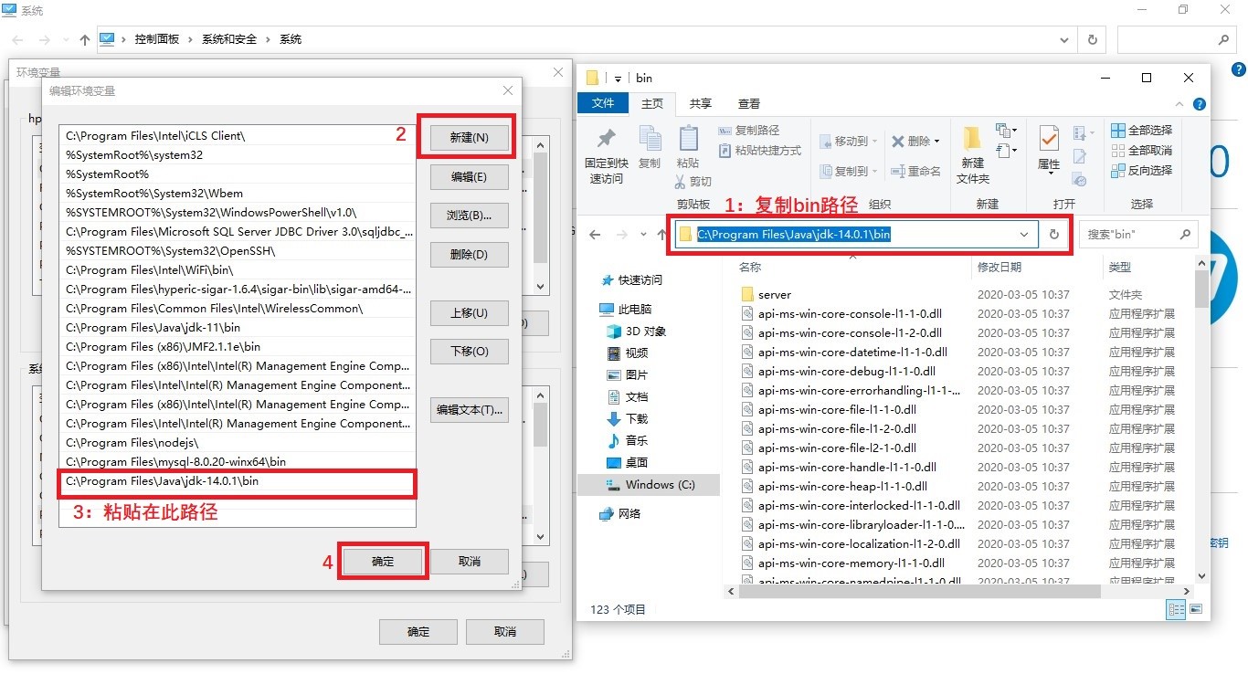 找到JDK安装bin配置文件, C:\Program Files\Java\jdk-14.0.1\bin (可以复制我的路径,注:你安装的路径和我的一样),新建,粘贴在选项里就OK啦。