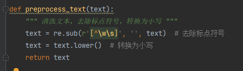 preprocess_text函数主要作用为清除文本中的标点符号和转化文本为小写,确保算法不受大小写及标点符号影响,本次测试用中文文本进行测试,因此该函数主要作用为清除标点符号。