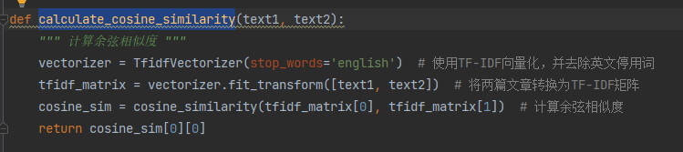 cosine_similarity函数主要作用为使用 TfidfVectorizer 将文本转换为TF-IDF矩阵,然后计算这两个文本之间的余弦相似度。