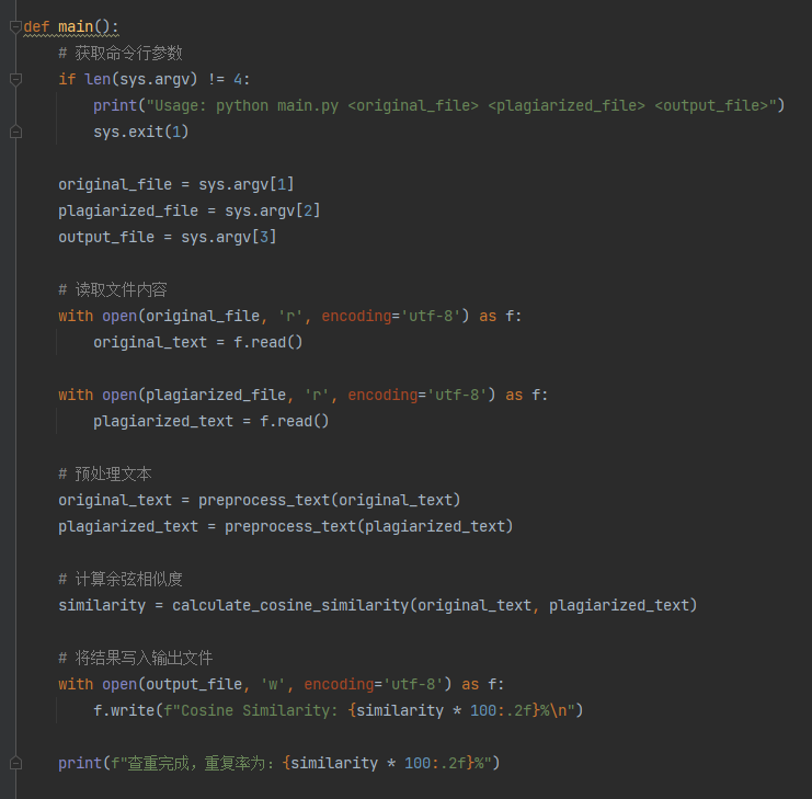 主函数运行流程为先从命令行获取原文文件、抄袭版文件和输出文件路径,再读取原文和抄袭版的内容,进行预处理,然后使用余弦相似度计算文本相似度,并将结果输出到指定的文件中。