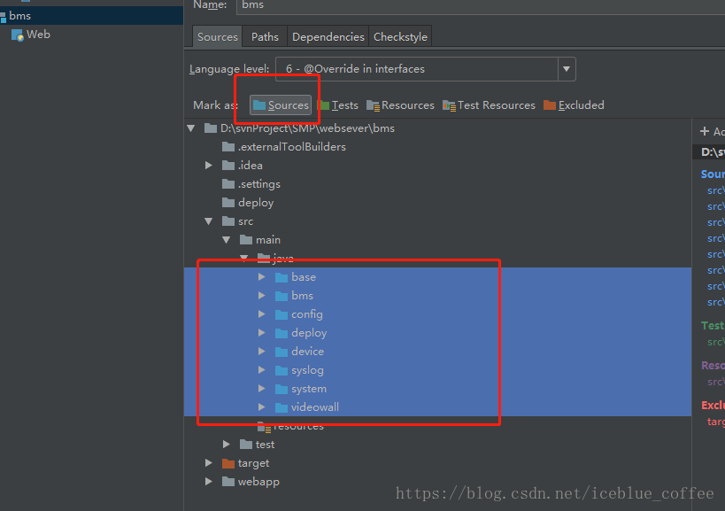 打开项目目录结构,选中源文件目录,点击sources 即可