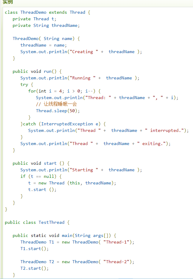 继承类必须重写 run() 方法,该方法是新线程的入口点。它也必须调用 start() 方法才能执行。