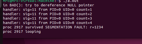 #include<stdio.h> #include<stdlib.h> #include<unistd.h> #include<signal.h> #include<setjmp.h> #include<string.h> jmp_buf env; int count = 0; void handler(int sig, siginfo_t *siginfo, void *context) { printf ("handler: sig=%d from PID=%d UID=%d count=%d\n", sig, siginfo->si_pid, siginfo->si_uid, ++count); if (count >= 4) // let it occur up to 4 times longjmp(env, 1234); } int BAD() { int *ip = 0; printf("in BAD(): try to dereference NULL pointer\n"); *ip = 123; // dereference a NULL pointer printf("should not see this line\n"); } int main (int argc, char *argv[]) { int r; struct sigaction act; memset(&act, 0, sizeof(act)); act.sa_sigaction = &handler; act.sa_flags = SA_SIGINFO; sigaction(SIGSEGV,&act,NULL); if ((r = setjmp(env)) == 0) BAD(); else printf("proc %d survived SEGMENTATION FAULT: r=%d\n",getpid(), r); printf("proc %d looping\n",getpid()); while(1); }