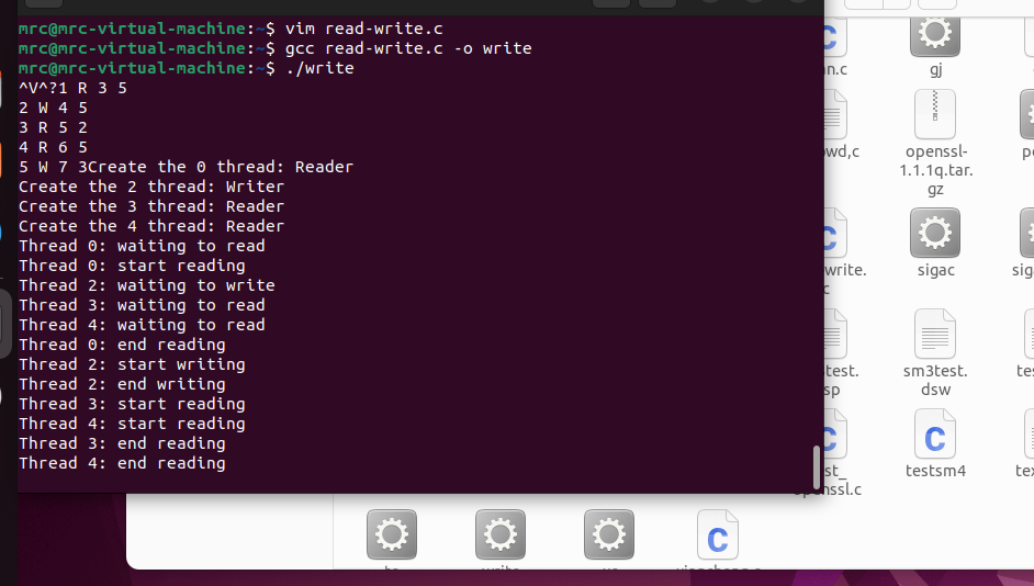 - 信号量mutex1在写者的进入区和退出区中使用,使得每次只有一个写者对其相应进入区或推出区进行操作,主要原因是进入区和退出区存在对变量writeCount的修改,每个写者其进入区中writeCount加1,退出区中writeCount减1。信号量RWMutex则是读者和写者两个之间的互斥信号量,保证每次只读或者只写。写者优先中,写者的操作应该优先于读者,则信号量一直被占用着,直到没有写者的时候才会释放,即当writeCount等于1的时候,申请信号量RWMutex,其余的写者无需再次申请,但是写者是不能同时进行写操作的,则需要设置一个信号量wrt来保证每次只有一个写者进行写操作,当写者的数量writeCount等于0的时候,则证明此时没有没有读者了,释放信号量RWMutex。信号量mutex2防止一次多个读者修改readCount。当readCount为1的时候,为阻止写者进行写操作,申请信号量wrt,则写者就无法进行写操作了。信号量mutex3的主要用处就是避免写者同时与多个读者进行竞争,读者中信号量RWMutex比mutex3先释放,则一旦有写者,写者可马上获得资源。