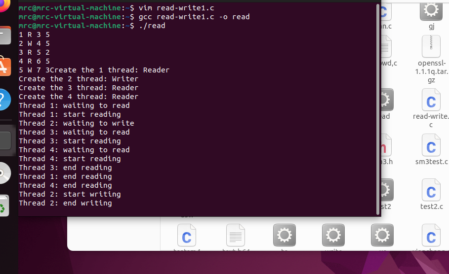 /* * 读者优先 */ # include <stdio.h> # include <stdlib.h> # include <time.h> # include <sys/types.h> # include <pthread.h> # include <semaphore.h> # include <string.h> # include <unistd.h> //semaphores sem_t wrt, mutex; int readCount; struct data { int id; int opTime; int lastTime; }; //读者 void* Reader(void* param) { int id = ((struct data*)param)->id; int lastTime = ((struct data*)param)->lastTime; int opTime = ((struct data*)param)->opTime; sleep(opTime); printf("Thread %d: waiting to read\n", id); sem_wait(&mutex); readCount++; if(readCount == 1) sem_wait(&wrt); sem_post(&mutex); printf("Thread %d: start reading\n", id); /* reading is performed */ sleep(lastTime); printf("Thread %d: end reading\n", id); sem_wait(&mutex); readCount--; if(readCount == 0) sem_post(&wrt); sem_post(&mutex); pthread_exit(0); } //写者 void* Writer(void* param) { int id = ((struct data*)param)->id; int lastTime = ((struct data*)param)->lastTime; int opTime = ((struct data*)param)->opTime; sleep(opTime); printf("Thread %d: waiting to write\n", id); sem_wait(&wrt); printf("Thread %d: start writing\n", id); /* writing is performed */ sleep(lastTime); printf("Thread %d: end writing\n", id); sem_post(&wrt); pthread_exit(0); } int main() { //pthread pthread_t tid; // the thread identifier pthread_attr_t attr; //set of thread attributes /* get the default attributes */ pthread_attr_init(&attr); //initial the semaphores sem_init(&mutex, 0, 1); sem_init(&wrt, 0, 1); readCount = 0; int id = 0; while(scanf("%d", &id) != EOF) { char role; //producer or consumer int opTime; //operating time int lastTime; //run time scanf("%c%d%d", &role, &opTime, &lastTime); struct data* d = (struct data*)malloc(sizeof(struct data)); d->id = id; d->opTime = opTime; d->lastTime = lastTime; if(role == 'R') { printf("Create the %d thread: Reader\n", id); pthread_create(&tid, &attr, Reader, d); } else if(role == 'W') { printf("Create the %d thread: Writer\n", id); pthread_create(&tid, &attr, Writer, d); } } //信号量销毁 sem_destroy(&mutex); sem_destroy(&wrt); return 0; }
