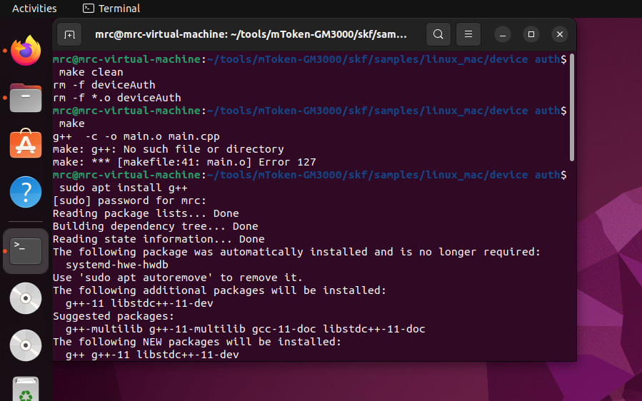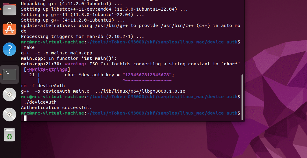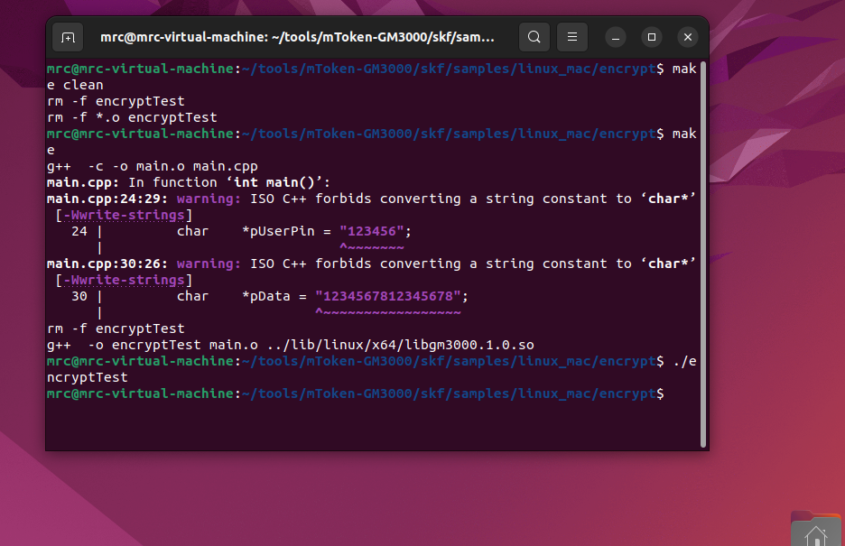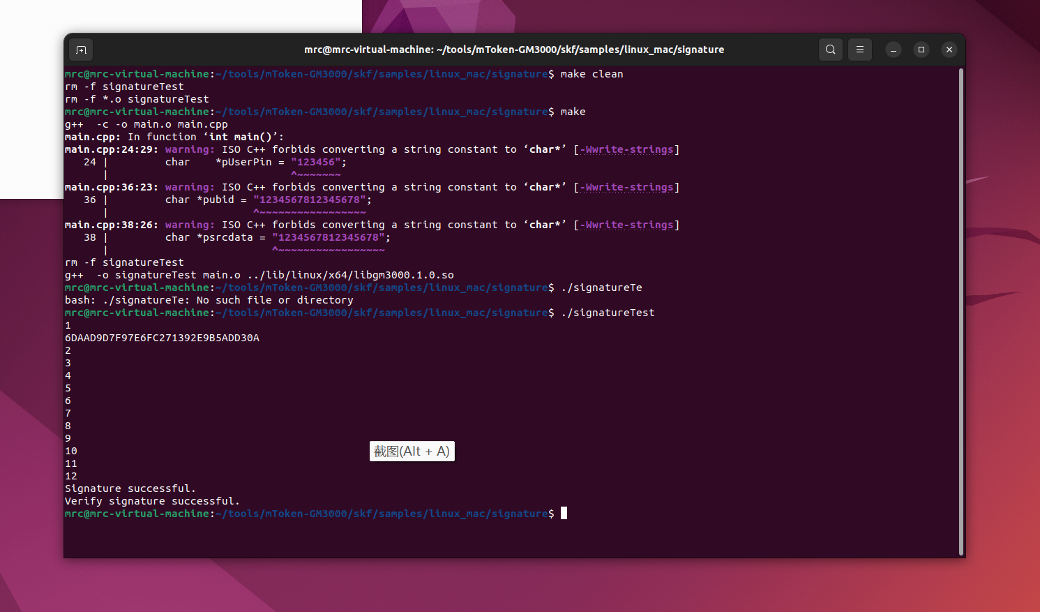 二、在Ubuntu中运行 “龙脉密码钥匙驱动实例工具等\mToken-GM3000\skf\samples\linux_mac”中例程,提交运行结果截图