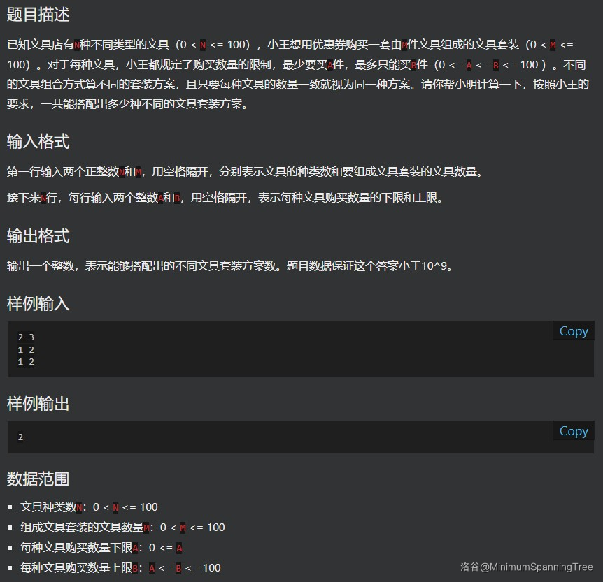 构造生成函数,对于第 \(i\) 个物品,生成函数为 \((x^{A^i}+\dots+x^{B_i})\),\(x^M\) 即是我们要求的答案。