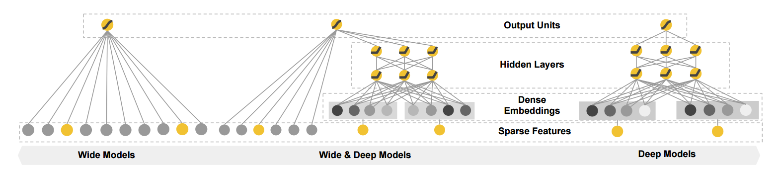 其中 \(c_{ki}\) 相当于是专家设计的一些特征组合 (只有为1的部分是囊括其中的). 对于第 \(k\) 个交叉特征, 其为 \(c_{ki} = 1\) 的特征的组合. 比如 AND(user_installed_app=netflix, impression-app=pandora), 只有当用户下载过netflix且pandora曝光过该特征为一, 特意强调这些特征是因为这些特征和最后的结果有密切的联系, 通过这些历史信息能够更容易地预测之后的用户的行为.