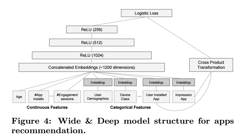 注意到, 仅安装的应用和曝光的应用作为 Wide 部分 (Cross Product) 的输入, 而其他的诸如用户年龄, 软件安装数量, 设备类型等都经过 Deep 部分进一步特征提取使用.