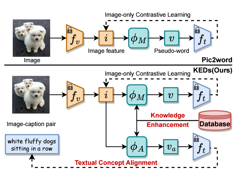 除了之前的 ZS-CIR 方法常用的 imgae-only contrastive learning 分支, KEDs: