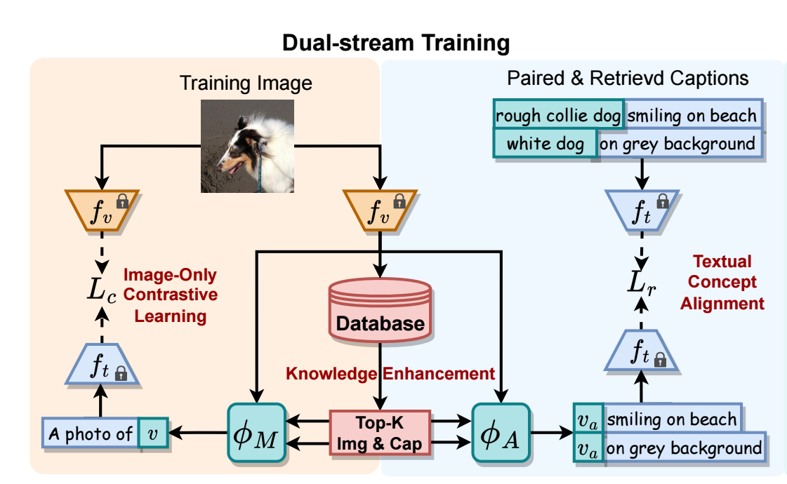 - 对于图片 \((\bm{I}, \bm{T})\), 通过 spacy 来得到额外的 context description, 在得到的 pseudo-triplets 上训练一个额外的 projection \(\phi_A\), 假设 \(\hat{\bm{v}}_a\) 是把经过 \(\phi_A\) 投影后的图片特征加到描述后经过 textual encoder \(f_t\) 得到的特征, 我们要求其和标题特征一致:\[\mathcal{L}_{cos} = 1 - \cos(\hat{\bm{v}}_a, \bm{t}); \]