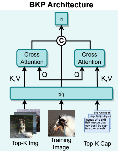 - 将这些信息进行融合, 分别得到\[\bm{v}_i = \text{CrossAttn}( \psi_l(\bm{i}), \psi_l (\{\bm{i}_k^r\}_{k=1}^K), \psi_l (\{\bm{i}_k^r\}_{k=1}^K), ), \\ \bm{v}_c = \text{CrossAttn}( \psi(\bm{i}), \psi_l (\{\bm{t}_k^r\}_{k=1}^K), \psi_l (\{\bm{t}_k^r\}_{k=1}^K), ); \]