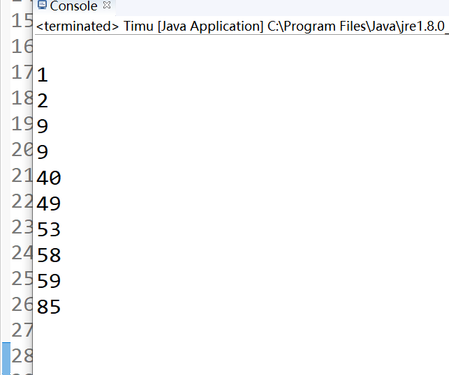 1、给定一个有9个整数(1,6,2,3,9,4,5,7,8)的数组,先排序,然后输出排序后的数组的值。