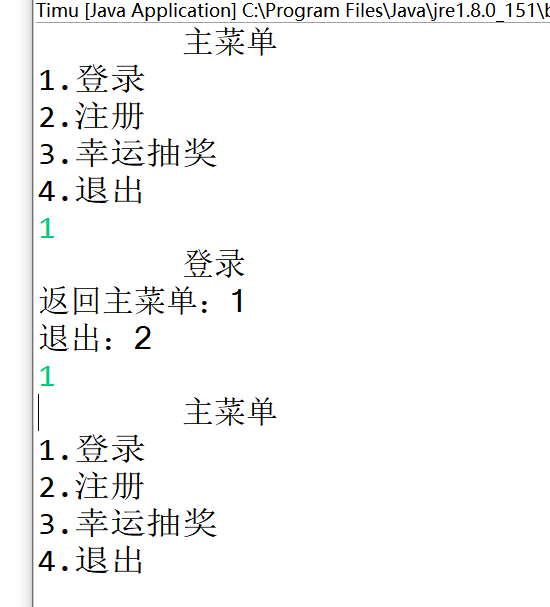 9、做一个菜单切换程序。主菜单1.登陆 2.注册 3幸运抽奖 4 退出。每个菜单可以返回主菜单
