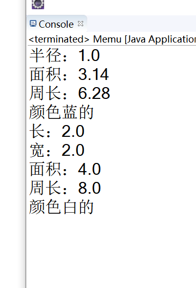 颜色属性 color ,有两个构造方法(一个是默认的、一个是为颜色赋值的),还有3个抽象方法,分别是: getArea 计算面积、 getPer 计算周长、 showAll 输出所有信息,还有一个求颜色的方法 getColor 。
