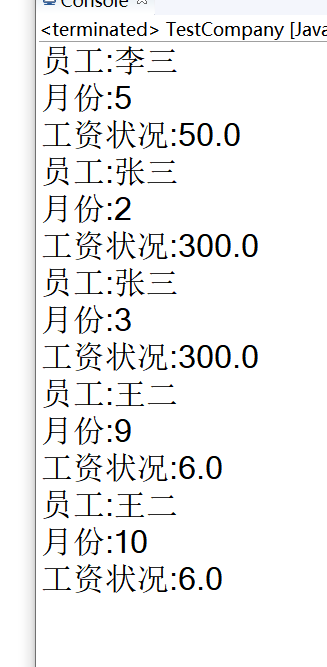 System.out.println("员工:"+test.name+"\n月份:"+month+"\n工资状况:"+test.getSalary(month));