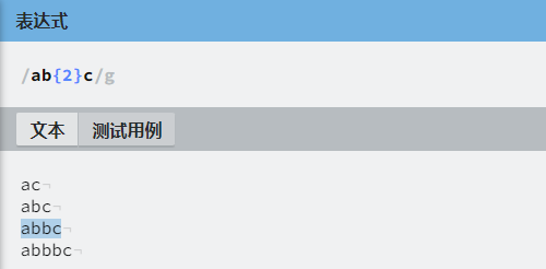 正则 ab{2}c 匹配 1个a 2个b 1个c