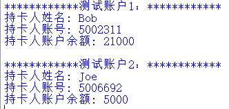 class Account: '''一个模拟银行账户的简单类''' def __init__(self, name, account_number, initial_amount = 10): '''构造新账户''' self._name = name self._card_no = account_number self._balance = initial_amount def deposit(self, amount): '''存款''' self._balance += amount def withdraw(self, amount): '''取款''' if self._balance < amount: print('余额不足') return self._balance -= amount def info(self): '''打印账户信息''' print('持卡人姓名:', self._name) print('持卡人账号:', self._card_no) print('持卡人账户余额:', self._balance) def get_balance(self): '''返回账户余额''' return self._balance def main(): '''创建Account类对象,测试类''' print('测试账户1:'.center(30, '*')) a1 = Account('Bob', '5002311', 20000) a1.deposit(5000) a1.withdraw(4000) a1.info() print() print('测试账户2:'.center(30, '*')) a2 = Account('Joe', '5006692', 20000) a2.withdraw(10000) a2.withdraw(5000) a2.info() if __name__ == '__main__': main()