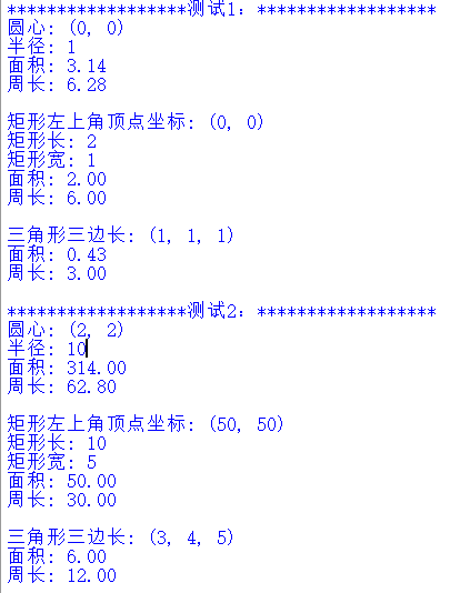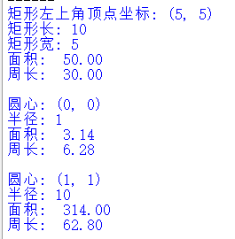 from shape import Rect, Circle shape_lst = [Rect(5, 5, 10, 5), Circle(), Circle(1, 1, 10)] for i in shape_lst: i.info() print(f'面积: {i.area(): .2f}') print(f'周长: {i.perimeter(): .2f}') print()