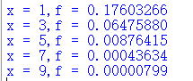 import math def func(x): '''定义函数''' m = 0 s = 2 ans = (1/(((2 * math.pi)**(1/2))*s)) * math.exp((-1/2)*((x-m)/s)**2) return ans print(f'x = 1,f = {func(1):.8f}') print(f'x = 3,f = {func(3):.8f}') print(f'x = 5,f = {func(5):.8f}') print(f'x = 7,f = {func(7):.8f}') print(f'x = 9,f = {func(9):.8f}')