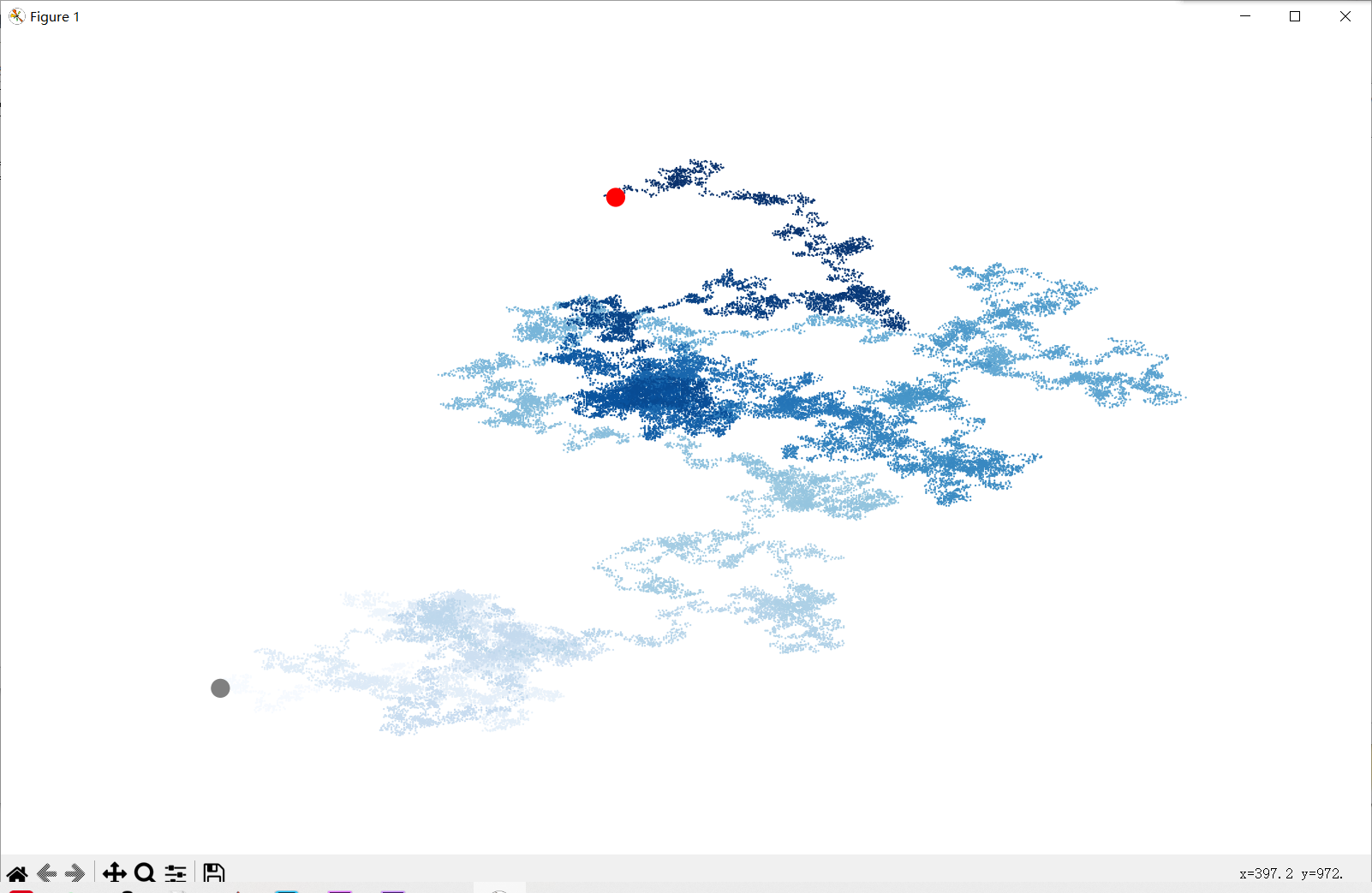 ''' 模拟多次随机漫步 ''' from matplotlib import pyplot as plt from random_walk import RandomWalk from time import sleep # 代码范例中,模拟两次随机漫步过程 n = 0 while n < 2: n += 1 # 创建一个RandomWalk对象,调用其方法生成随机游走坐标 rw = RandomWalk(50000) rw.fill_walk() # 用散点图进行可视化绘制 plt.figure(figsize = (10, 6), dpi = 128) point_numbers = list(range(rw.num_points)) plt.scatter(rw.x_values, rw.y_values, c=point_numbers,cmap=plt.cm.Blues, edgecolor='none', s=1) # 终点和起点 plt.scatter(0, 0, c = 'grey', edgecolors='none', s=100) plt.scatter(rw.x_values[-1], rw.y_values[-1], c = 'red', edgecolors='none', s=100) # 隐藏坐标轴 plt.axis('off') plt.show()