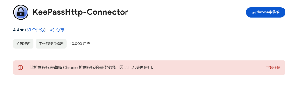 PS:从2025年3月开始,最新版本Chrome浏览器禁止了这个“KeePassHttp-Connector”插件,原因是:此扩展程序未遵循 Chrome 扩展程序的最佳实践,因此已无法再使用。