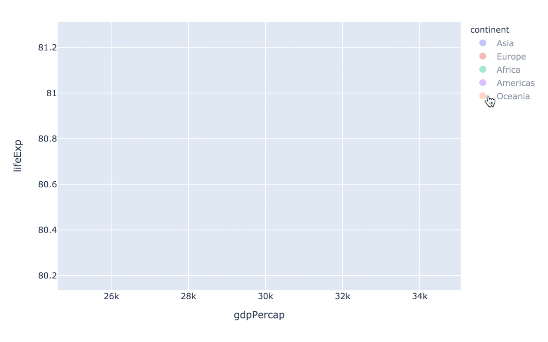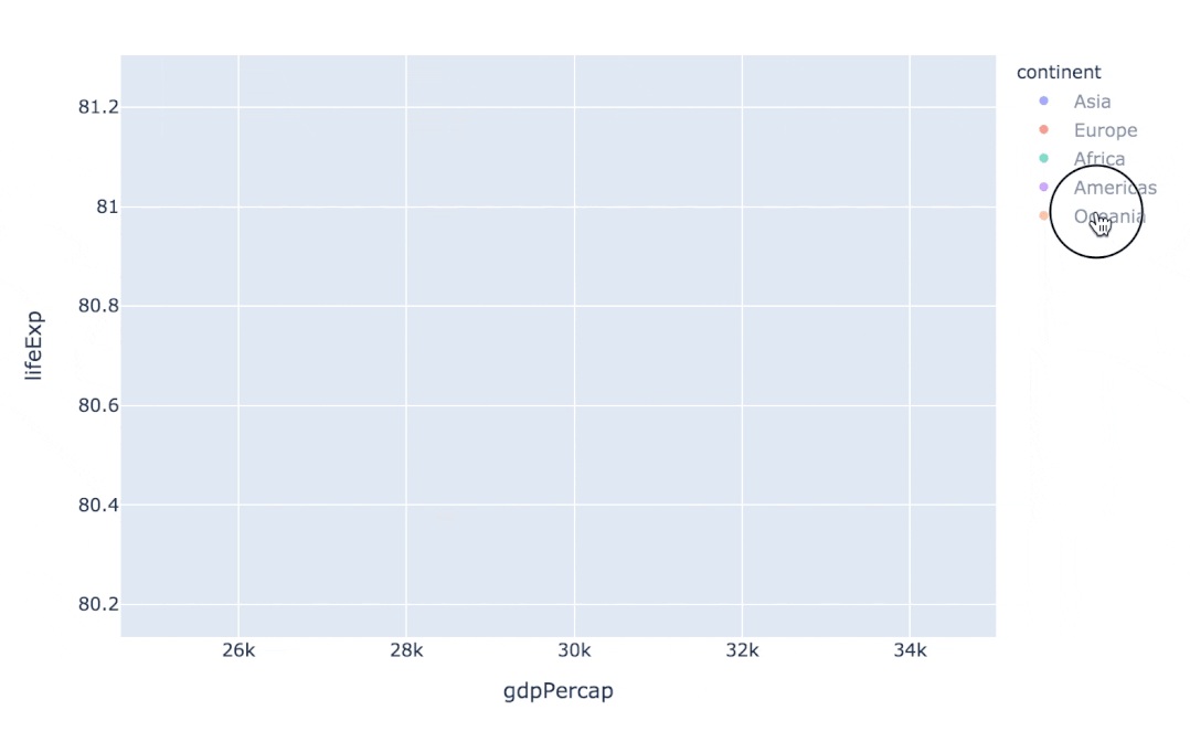 px.scatter( gapminder2007 # 绘图DataFrame数据集 ,x="gdpPercap" # 横坐标 ,y="lifeExp" # 纵坐标 ,color="continent" # 区分颜色 ,size="pop" # 区分圆的大小 ,size_max=60 # 散点大小 )