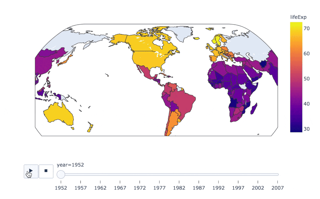 在实际的工作中,我们可能会接触到中国地图甚至是全球地图,使用px也能制作:px.choropleth( gapminder, # 数据集 locations="iso_alpha", # 配合颜色color显示 color="lifeExp", # 颜色的字段选择 hover_name="country", # 悬停字段名字 animation_frame="year", # 注释 color_continuous_scale=px.colors.sequential.Plasma, # 颜色变化 projection="natural earth" # 全球地图 )