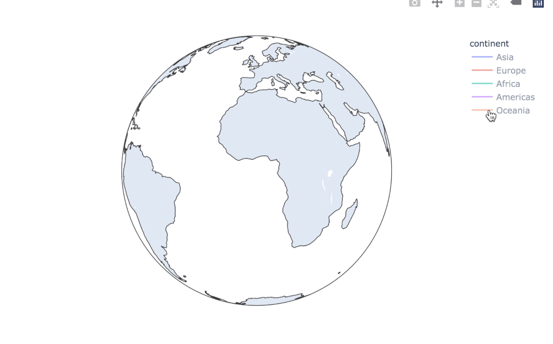 fig = px.line_geo( gapminder2007, # 数据集 locations="iso_alpha", # 配合和color显示数据 color="continent", # 颜色 projection="orthographic") # 球形的地图 fig.show()