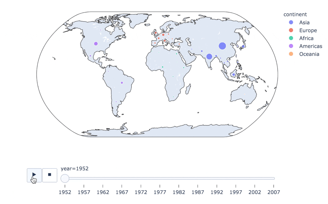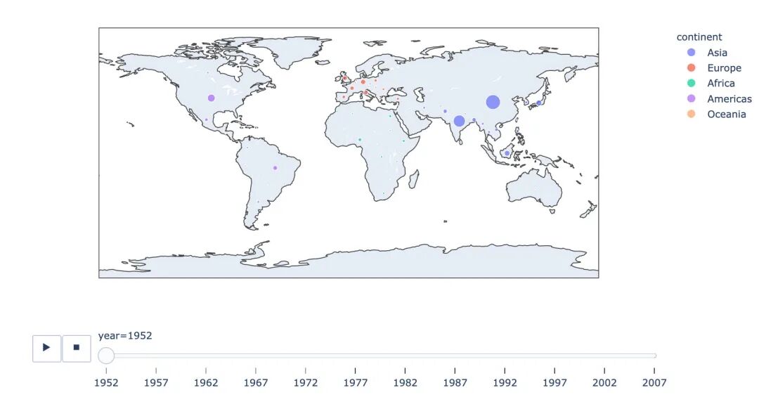 fig = px.scatter_geo( gapminder, # 数据 locations="iso_alpha", # 配合颜色color显示 color="continent", # 颜色 hover_name="country", # 悬停数据 size="pop", # 大小 animation_frame="year", # 数据帧的选择 projection="natural earth" # 全球地图 ) fig.show()