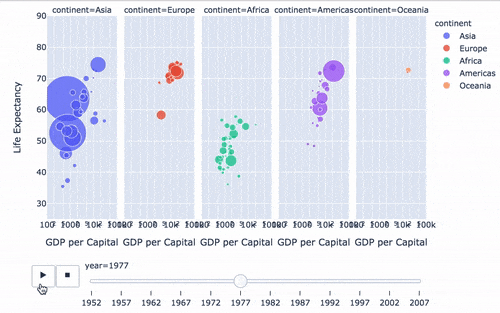 facet_col、animation_frame参数还能将散点进行分块显示:px.scatter( gapminder # 绘图使用的数据 ,x="gdpPercap" # 横纵坐标使用的数据 ,y="lifeExp" # 纵坐标数据 ,color="continent" # 区分颜色的属性 ,size="pop" # 区分圆的大小 ,size_max=60 # 圆的最大值 ,hover_name="country" # 图中可视化最上面的名字 ,animation_frame="year" # 横轴滚动栏的属性year ,animation_group="country" # 标注的分组 ,facet_col="continent" # 按照国家country属性进行分格显示 ,log_x=True # 横坐标表取对数 ,range_x=[100,100000] # 横轴取值范围 ,range_y=[25,90] # 纵轴范围 ,labels=dict(pop="Populations", # 属性名字的变化,更直观 gdpPercap="GDP per Capital", lifeExp="Life Expectancy") )