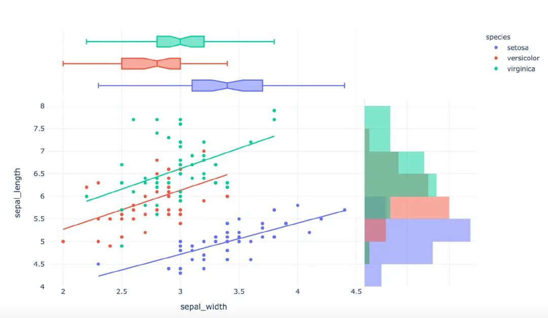 px.scatter( iris, # 数据集 x="sepal_width", # 横坐标值 y="sepal_length", # 纵坐标取值 color="species", # 颜色 marginal_x="box", # 横坐标为箱型图 marginal_y="histogram", # 纵坐标为直方图 height=600, # 高度 trendline="ols", # 显示趋势线 template="plotly") # 主题