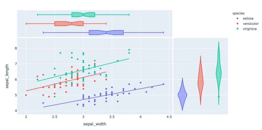 小提琴图能够很好的显示数据的分布和误差情况,一行代码利用也能显示小提琴图:px.scatter( iris, # 数据集 x="sepal_width", # 横坐标 y="sepal_length", # 纵坐标 color="species", # 颜色 marginal_y="violin", # 纵坐标小提琴图 marginal_x="box", # 横坐标箱型图 trendline="ols" # 趋势线 )
