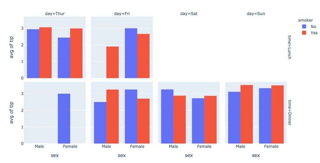 fig = px.histogram( tips, # 绘图数据集 x="sex", # 横轴为性别 y="tip", # 纵轴为费用 histfunc="avg", # 直方图显示的函数 color="smoker", # 颜色 barmode="group", # 柱状图模式 facet_row="time", # 行取值 facet_col="day", # 列取值 category_orders={ # 分类顺序 "day":["Thur","Fri","Sat","Sun"], "time":["Lunch","Dinner"]} ) fig.show()